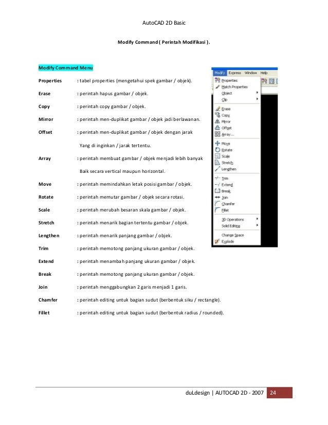 autocad adalah software drafting yang digunakan untuk menggambar bentuk 2d maupun 3d. perintah dasar memodifikasi gambar dengan autocad 5. Selain mengetahui perintah, anda juga perlu mengenali fitur dasar autocad 2d, misalnya offset, copy, array, move, rotate, trim, extend, mirror, dan scale. Untuk lebih memahami materi, silahkan berkunjung ke latihan autocad 2d dan autocad 3d. Namun banyak user belum mengetahui, bahwa di autocad bisa membuat dimensi berurutan dengan.