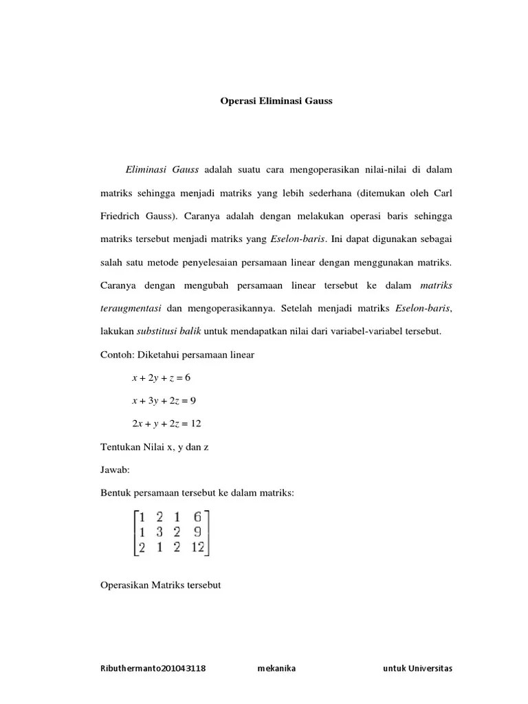 Contoh eliminasi gauss jordan (1/1). Penyelesaian sistem persamaan linier (spl). Contoh soal sistem persamaan linear 3 variabel: Contoh eliminasi gauss jordan (1/1). Ubah menjadi bentuk eselon baris dengan melakukan operasi baris elementer.